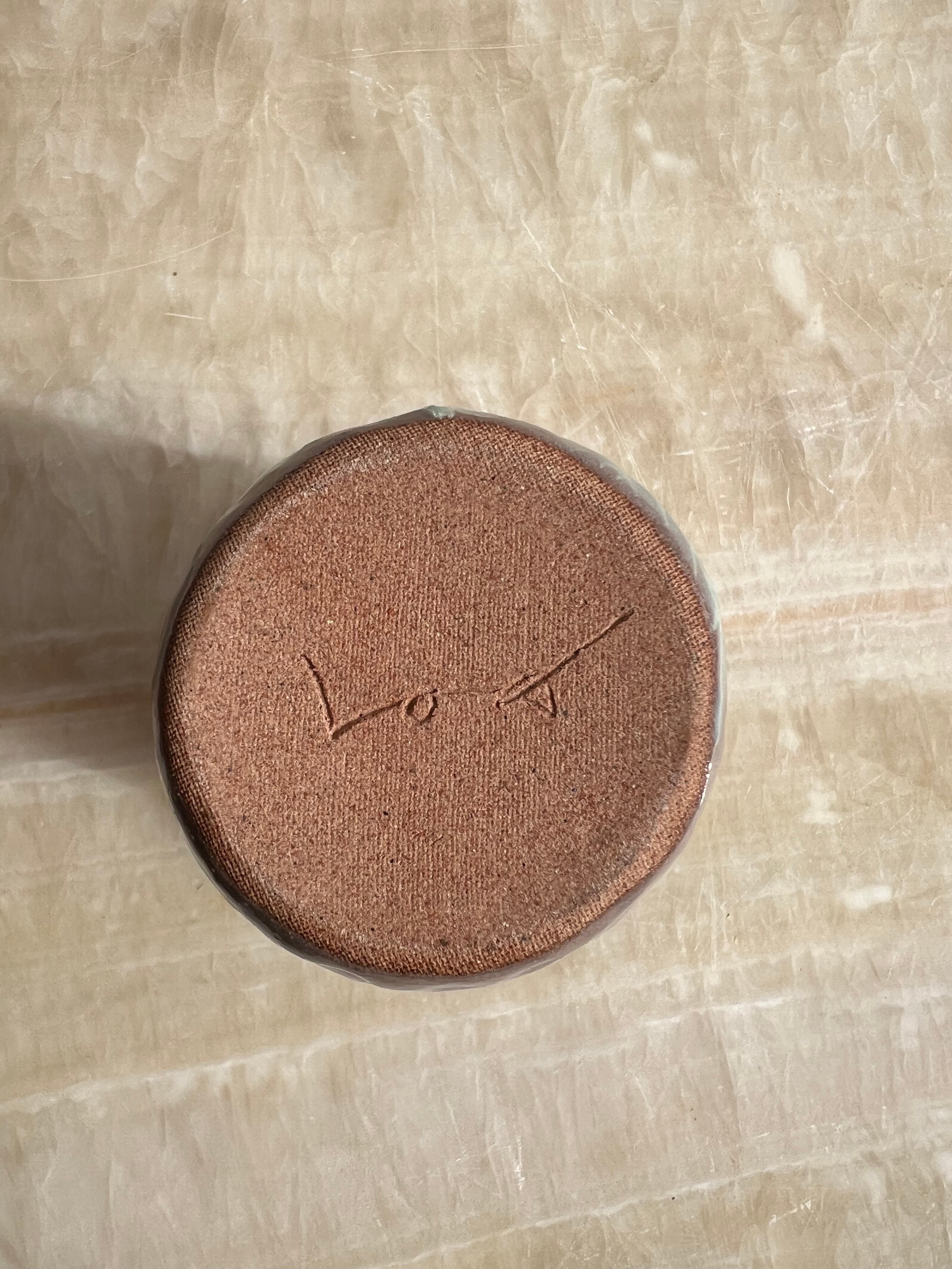 このカップは、「手捻り」と「色粘土象嵌(しきしょく縄文)」という技法を組み合わせて、ひとつひとつ手作業で制作しています。