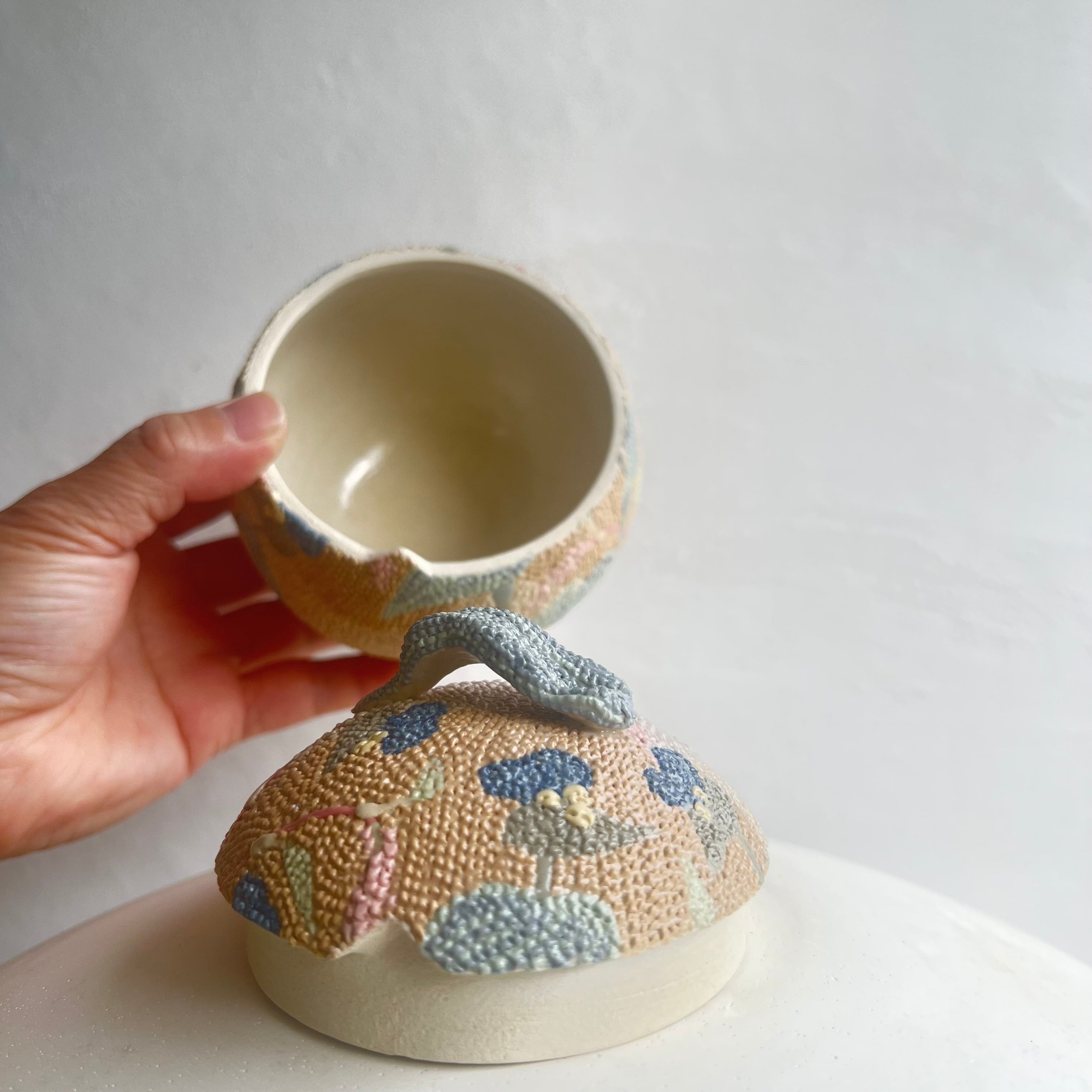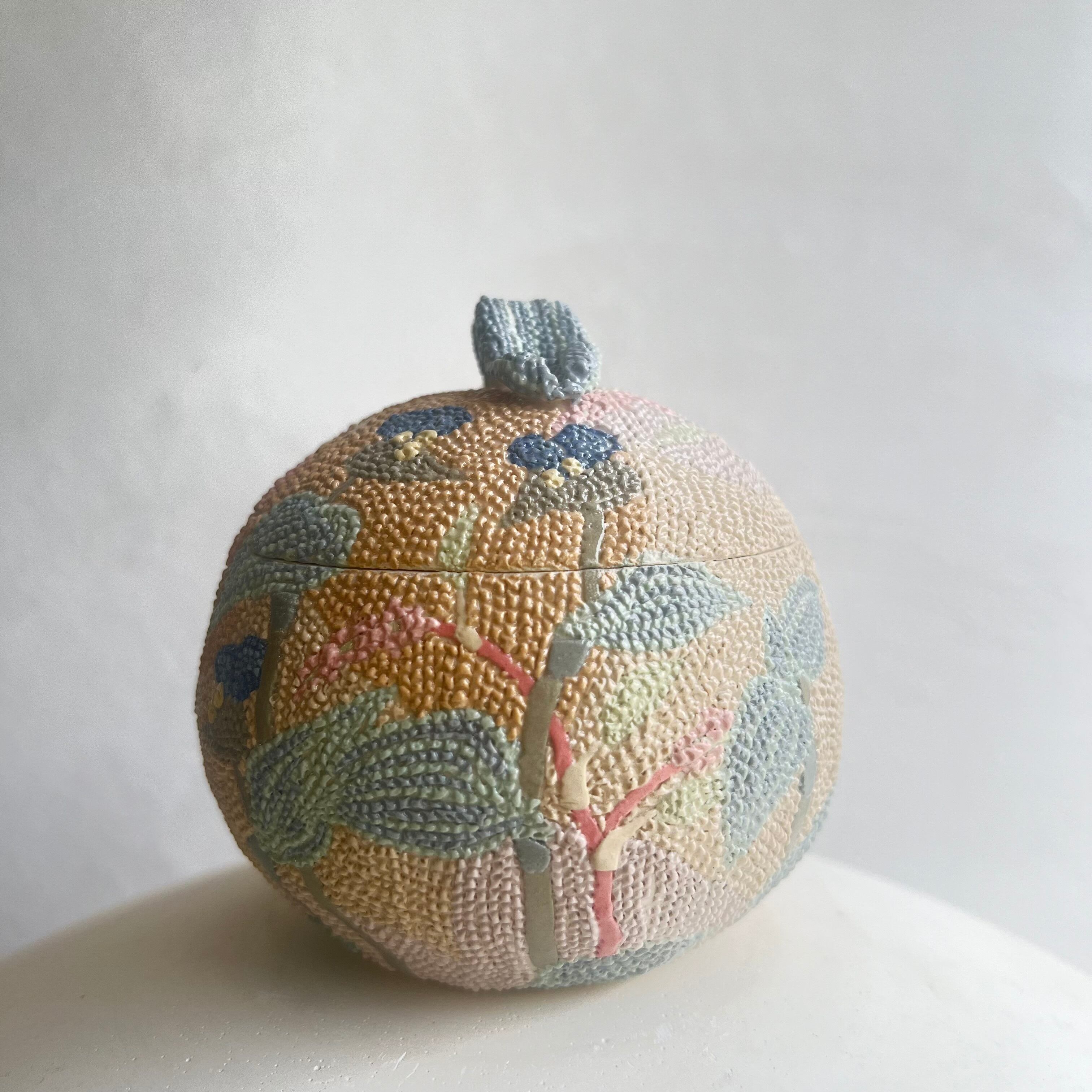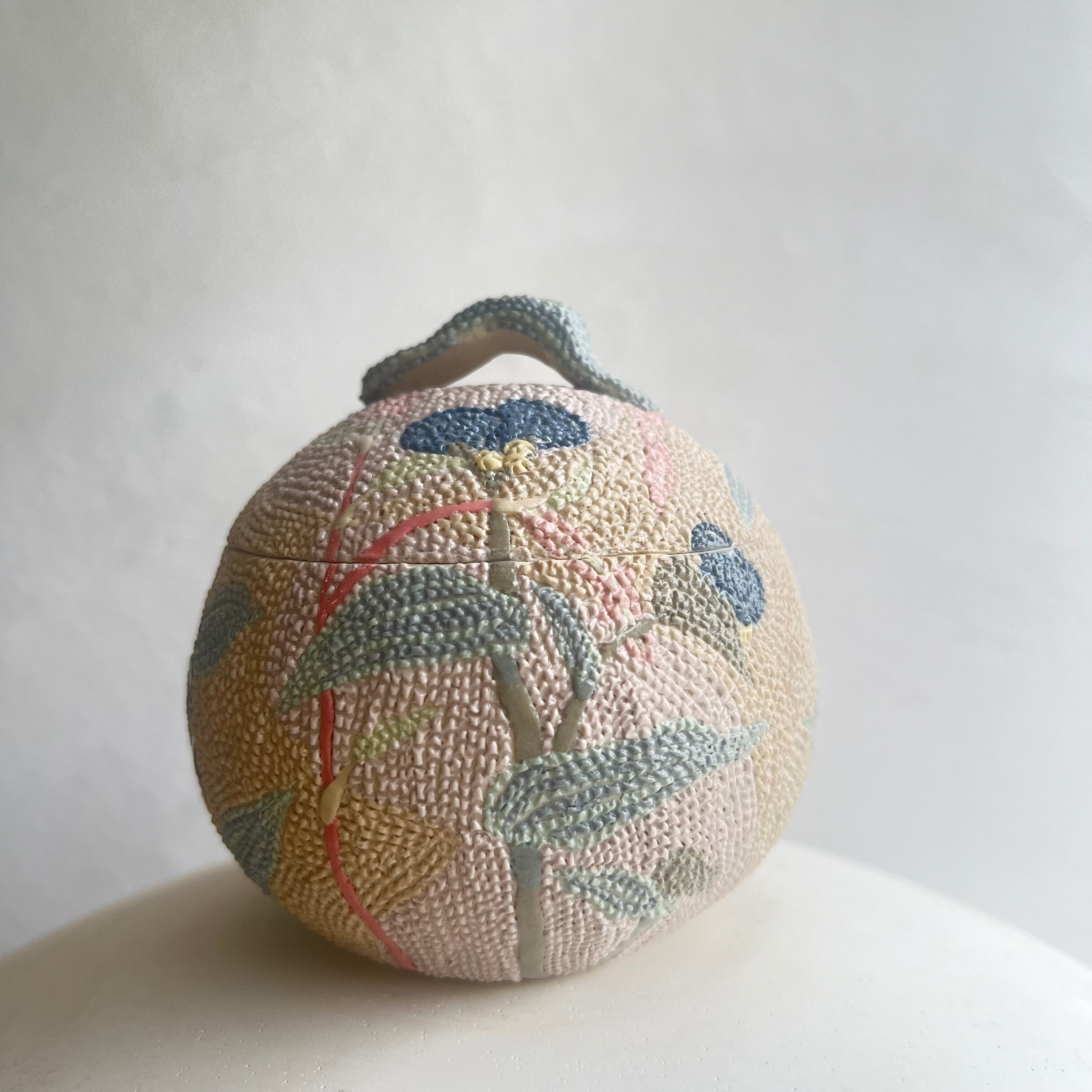色植縄紋 蓋物 「ツユクサとイヌタデ 」